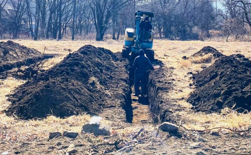 ▲縄文遺跡の跡地を試掘調査している様子。