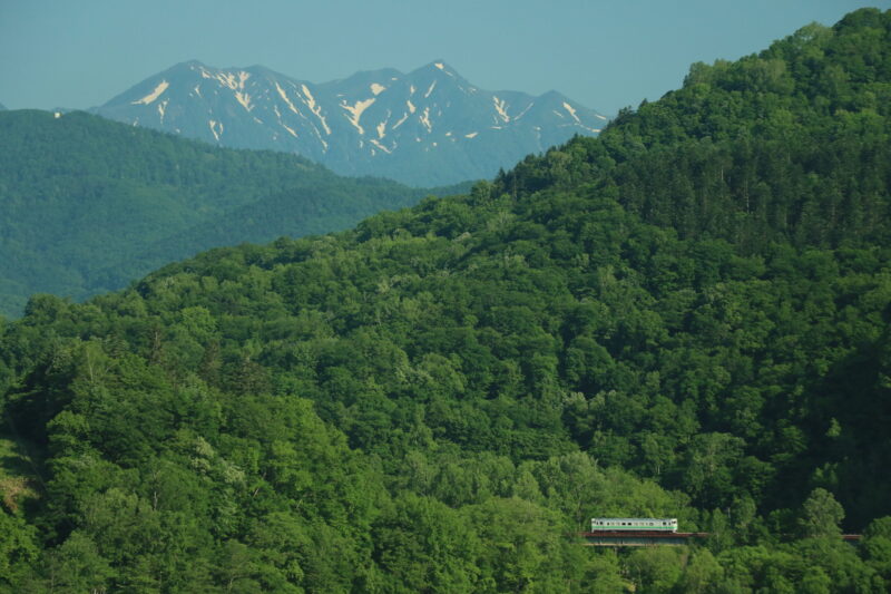▲雄大な夕張山地の中央に位置する芦別岳を背後に、大自然の中を1両だけの根室本線の普通列車が走り抜ける。