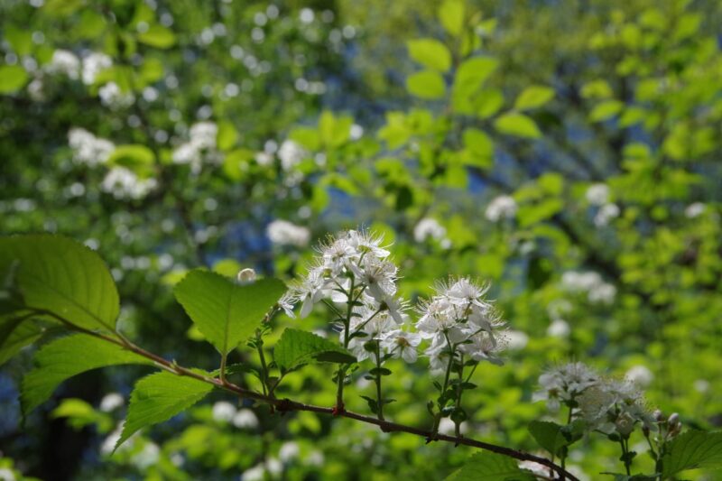 ▲新緑の季節。ミヤマザクラの花が咲く。(山梨県北杜市大泉町)