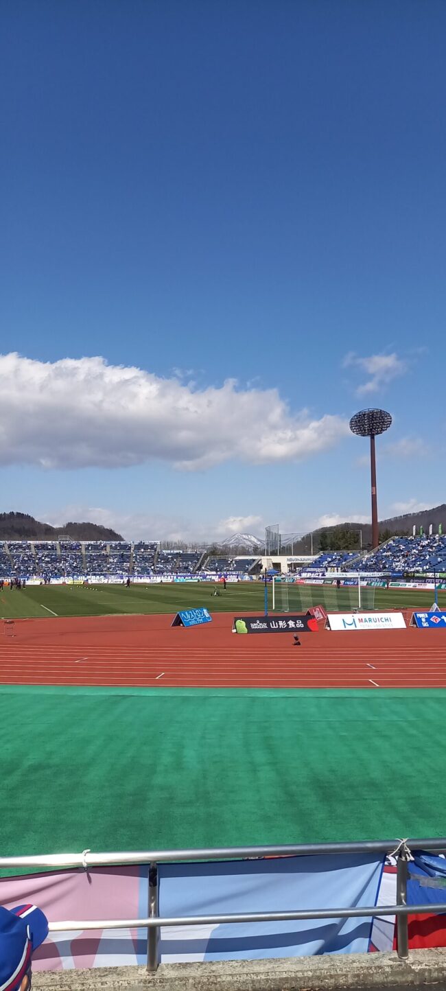 ▲3月16日モンテディオ山形戦、NDソフトスタジアム山形(天童市)。雪が残る山々が美しかったです。