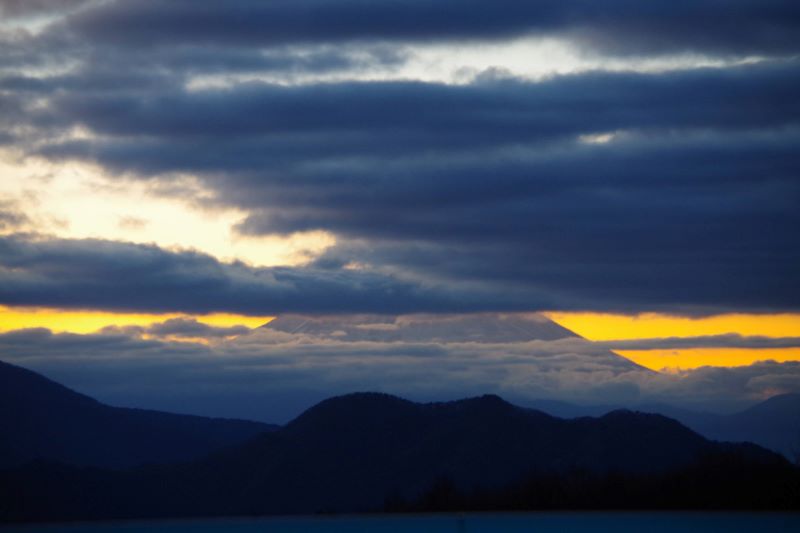 ▲雲の先から現れる、夜明けの富士。(山梨県北杜市大泉町)