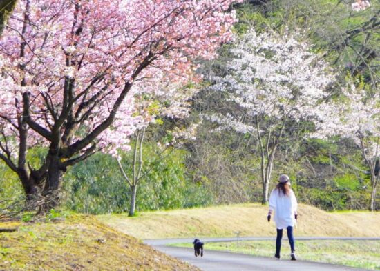 ▲沿道には桜の花。相棒と過ごす、日常の一コマ。(山梨県北杜市)