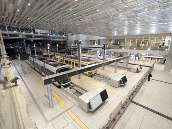 ▲路面電車がエキナカに乗り入れる配線は、富山地鉄の富山駅等で実用化されていますが、2階に高架で乗り入れるのは今回は日本初。