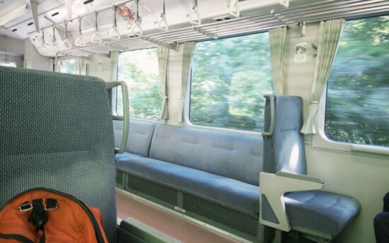 無人駅の為、駅員はおらず、ホームで待つのは我々夫婦のみ。誰もいない駅でポツンといるのは初めてで、列車は来るのだろうかと少し心配になりましたが、時刻通りに到着。乗り込むと、人はまばらで席にも余裕がありました。