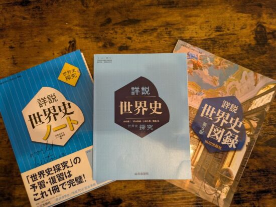 これでは全然ダメだ!!ということで、私の時代にもあった青い表紙の教科書(最新版)と私の時代にはおそらくなかっただろう「世界史ノート」、ついでに資料集も購入。語句の穴埋めをメインに毎日数ページ進めています。
