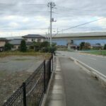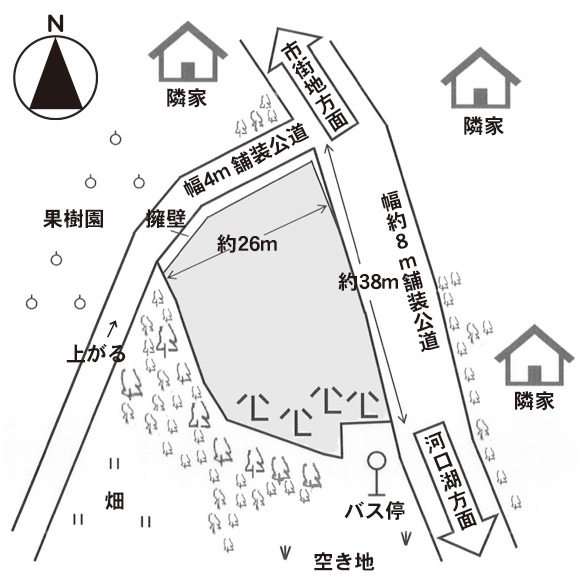 東側が幅約8m舗装公道に約40m、北側が幅約4m舗装公道に約34m隣接