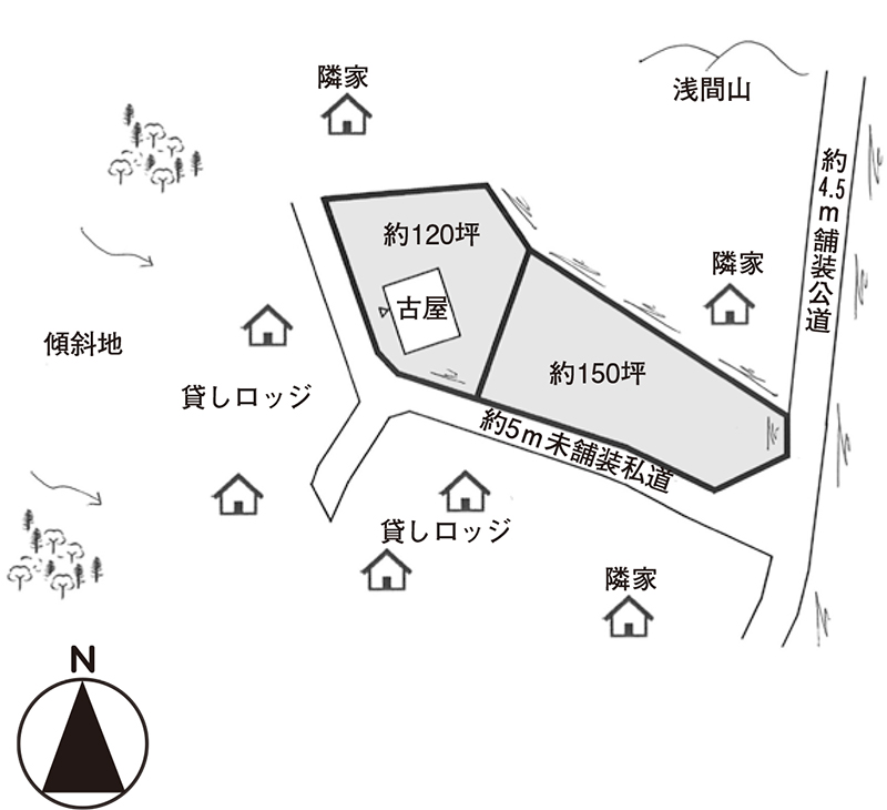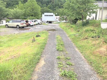 南側が幅約5mの未舗装私道に接する。
