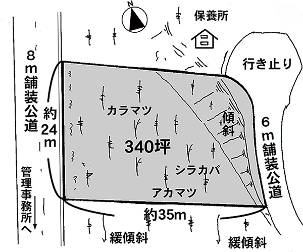 北西側が幅約9m、南東側が幅約6mの舗装公道に接する。