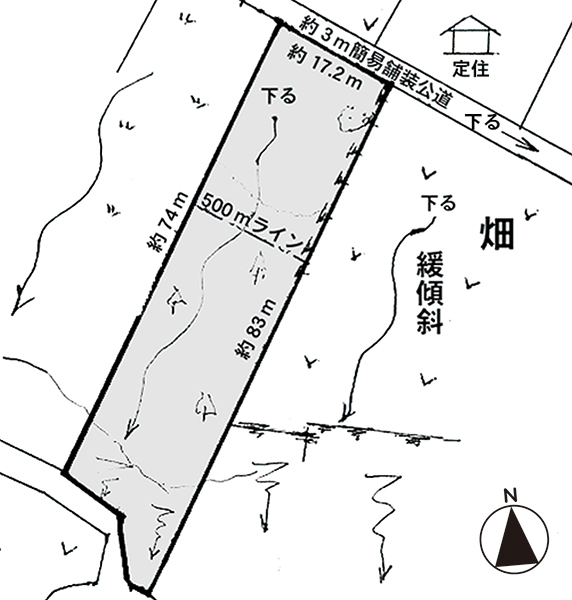 北側が幅約3mの舗装公道に接する