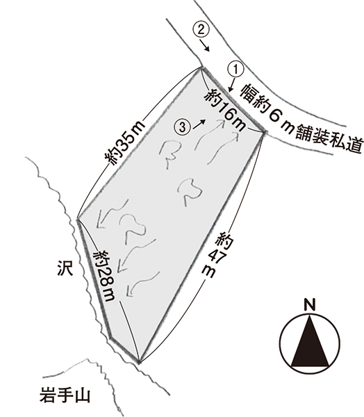 北側が幅約6mの舗装私道に接する