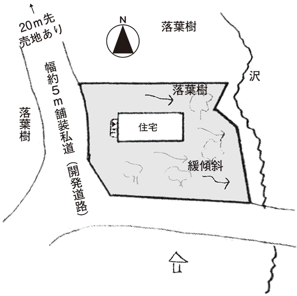 西側、南側が幅約5mの舗装私道に接する(開発道路)