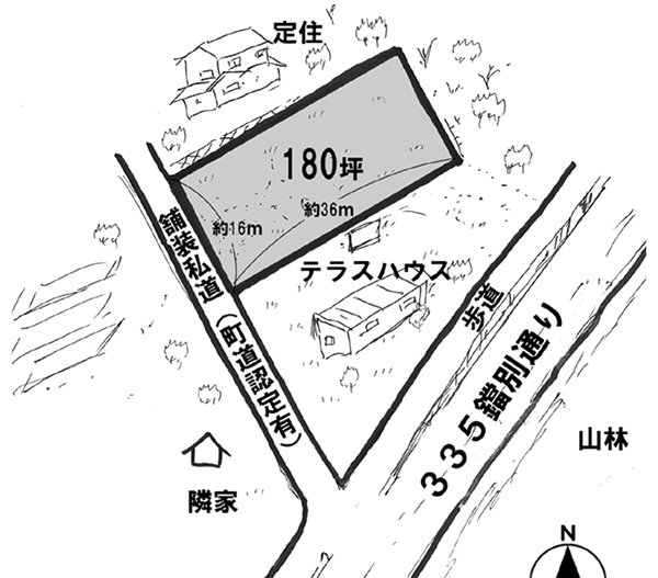 南西側が幅約6mの舗装私道(町道認定有)に接する