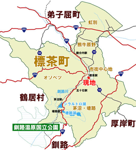 釧網本線標茶駅より1.4km、中標津空港へ約56km、釧路空港より約65km、女満別空港より約92km