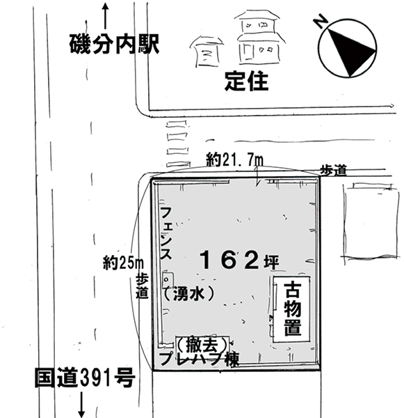 アイヌ語「イソポウンナイ」は「うさぎがいる沢」を意味し、釧路川支流の磯分内川が流れ、小さな無人駅・「磯分内駅」の周りには静かな住宅街が形成されている。国道391号線は南の釧路市から標茶、弟子屈町を経由してオホーツク海・網走市まで抜け、磯分内には雪印の大きな工場がある。物件は釧網本線・「磯分内駅」から直線に120mほど行ったメイン道路の角地にある土地。もともと昭和42年築の2階建ての店舗住宅があったが解体撤去。同じ頃と推定される未登記のシャッター付の車庫物置とプレハブ事務所棟があり、プレハブ棟は売主側で撤去する。(希望者は別途購入可)敷地内に自然流水があるのは魅力。