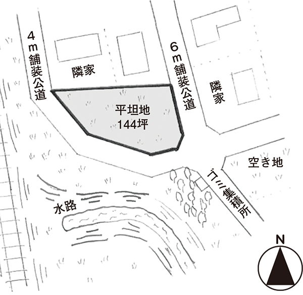 東、南側が幅6m、西側が幅約4mの舗装公道に接する。