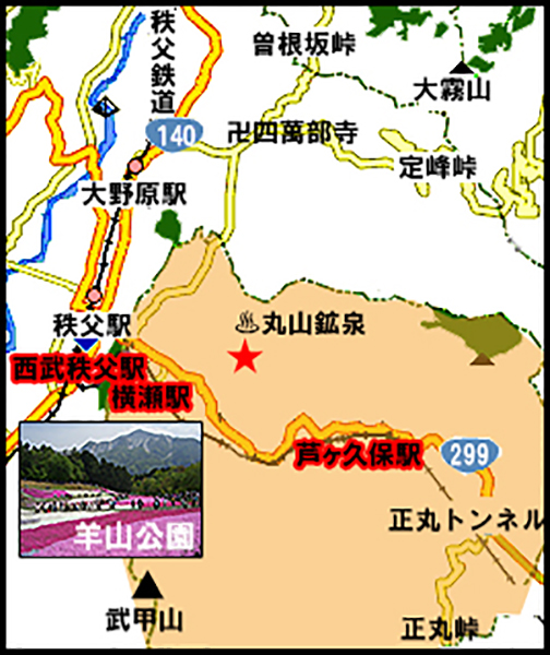 西武秩父線横瀬駅より約2.9km、皆野寄居有料道路皆野長瀞ICより約13.3km