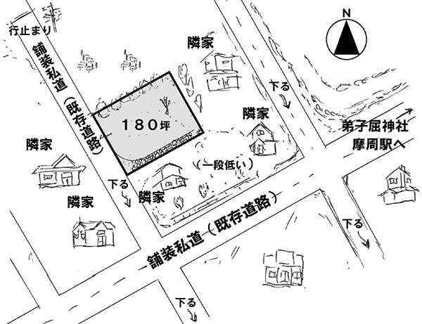西側が幅約7.2mの舗装私道(法第42項1項3号)に接する。