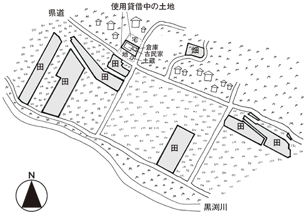 母屋のある宅地の北東側空き地及び南西側土蔵のある土地は、相続人不存在地として使用貸借中です。