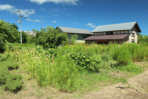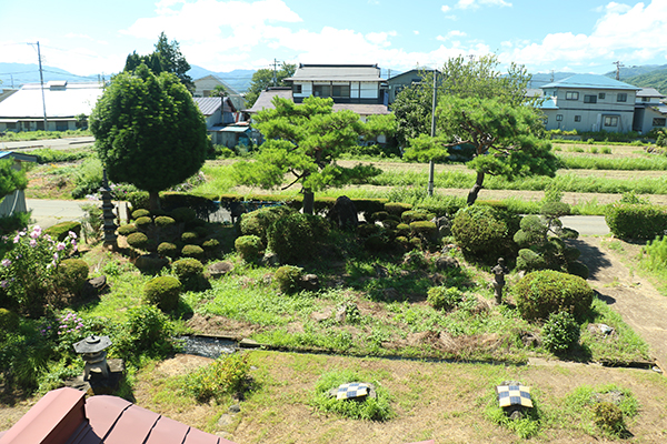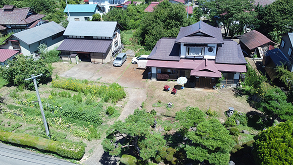 会津盆地の農村集落に位置する、畑と庭園と倉庫付の2階建住宅