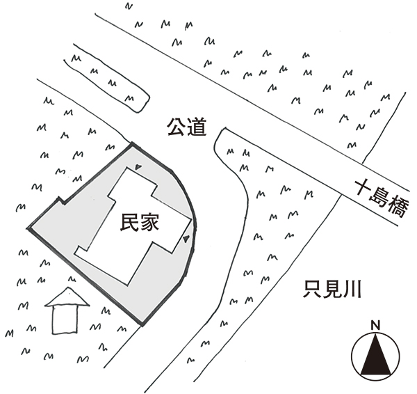 南東側が幅約7m、北東側に幅約17mの舗装公道に接する