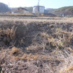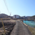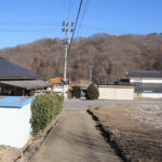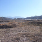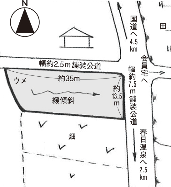 国道から春日温泉に向って4.5km。この町の中心集落の一つである春日地区から農地を隔てて0.8kmの周囲を畑と水田がとり囲む伸びやかな地にある。ご近所は道路向いに東と北に一軒ずつ。南には農地が広がり蓼科山がある。勿論北東の浅間山も見え陽当りも大変に良い。現況は未耕作の畑で農振解除と農地転用許可が必要となる。東と北が道路に接した土地であるためより広く感じる。公営水道と公共下水道も利用できる。