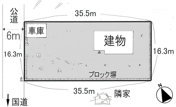 西側が幅約6mの舗装公道に接する
