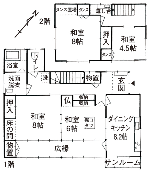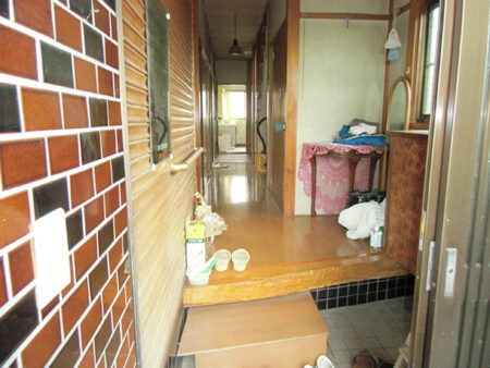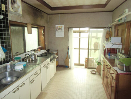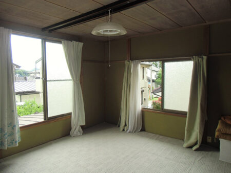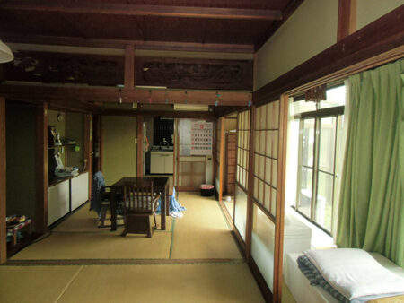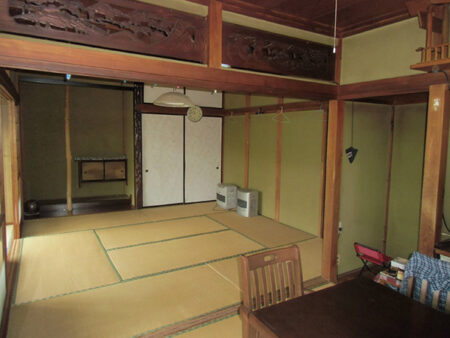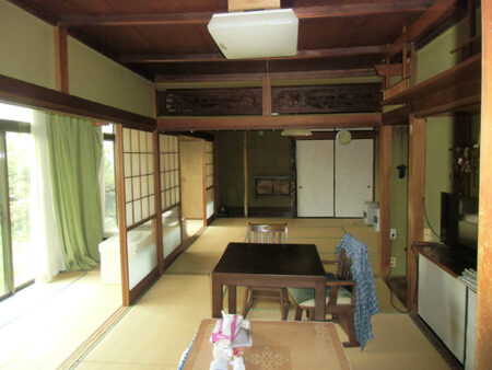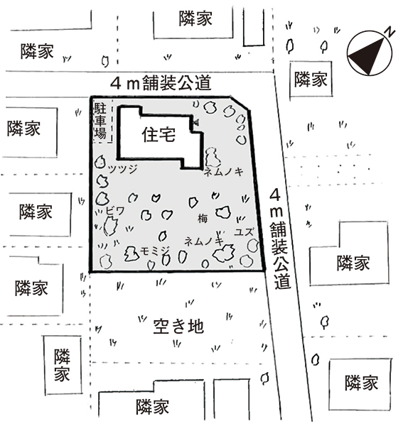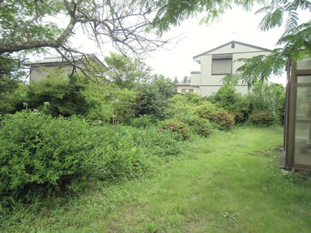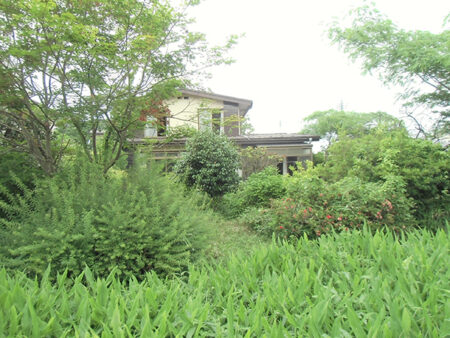物件の特徴は駅やIC、スーパーなどが近く、便利ということ。古い住宅地ではあるが寂れて暗い雰囲気はない。接する道路も近所の住民しか通らず静かな環境。また、南側が空き地、東、北の2方向が公道により空間が保たれ、陽当たりも良く煩わしさも感じない。175坪の敷地では多種多様の木々が植わる。たくさんあるツツジや大きなネムノキなどは伐採し、菜園用地を作っても良く、その余裕は充分ある。住宅は建築から50年が経過しているが、水回りは一度改修されている。補修は床の一部のみで済みそう。堀炬燵も粋な設備だ。2階建だがこじんまりして田舎暮らしに大きすぎない。周辺は平坦地のため徒歩、自転車での買い物や駅へ行き来が楽だ。