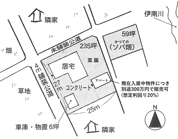 敷地内にあるアパートは追加300万にて別途販売可。想定家賃収入は年間60万円で、アパート分も含めると固定資産税は年56,500円。アパートを売買に含めない場合の借地権や土地分筆については要相談。