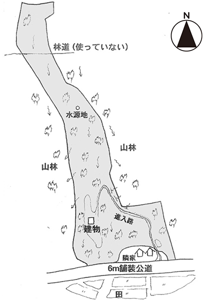 南側の一部他人地(通行承諾あり)を通り約6m の舗装公道に繋がる。