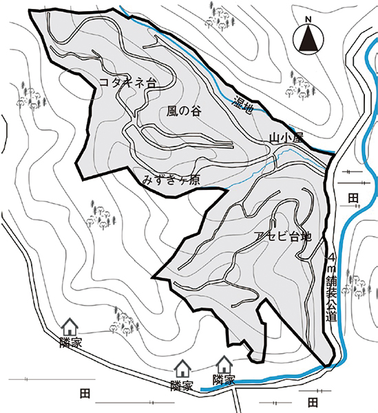 東側が幅約4mの舗装公道に接する。