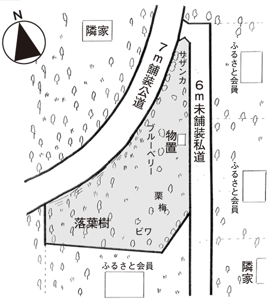 芦野温泉へ車で約5分。那須山、湯本方面とは対照的に、牧歌的田園風景のなかにある土地。隣家のほとんどがふるさと会員宅で、溶け込めやすい場所だ。公道と私道の2方向接道、南側に向かって末広がりの地型で使い勝手も良い。物件内を含め周囲の木々は落葉樹のため冬は陽射しがたっぷり。売主はマメに草刈りや剪定をし、果樹を育てたりしているのでいつ見てもきれいな状態。飲用水は井戸を掘削する必要(要100万円)があるが、散水用としても使えるのでそれが良いだろう。