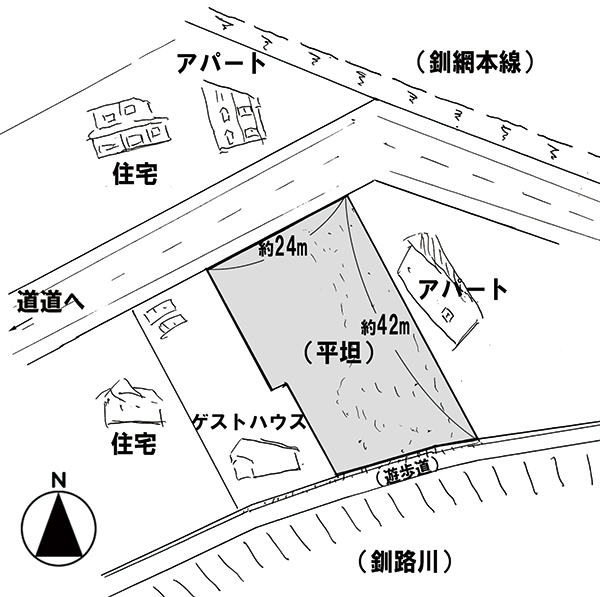 摩周駅の1km圏内はスーパーやホームセンター、コンビニなど買物施設が充実している町の中心地。物件は駅の西側に位置する湯の島地区にあり、南側には釧路川が流れ、川沿いは遊歩道が整備されている。道路向かいの高台には釧網本線が走り、少し歩くと美羅尾山が望め、散歩コースも充実している。県道から一本入った住宅地の一角で、以前はアパートが建っていた2筆の土地。すでに建物は解体され平坦に造成されている。用途地域は第一種住居地域の指定があり、釧路川のせせらぎが聴こえる民泊施設や民宿、ガレージ・車庫など法令のもと、一般住宅以外の利用用途も色々と考えられる。