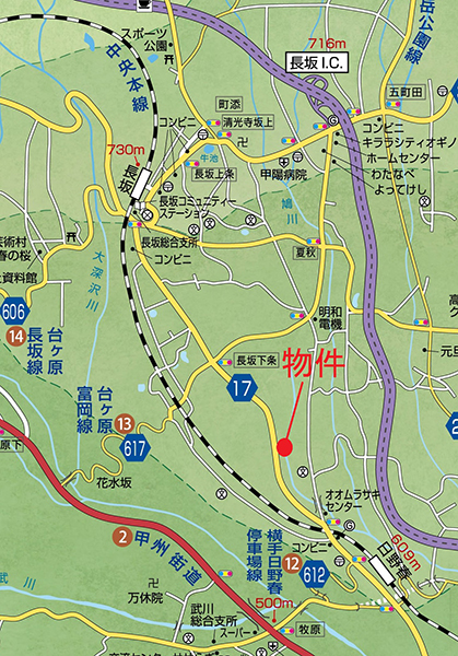 長坂総合支所・郵便局へ約4km、コンビニへ約1.2km、小学校・スーパー・甲陽病院へ約4.5km