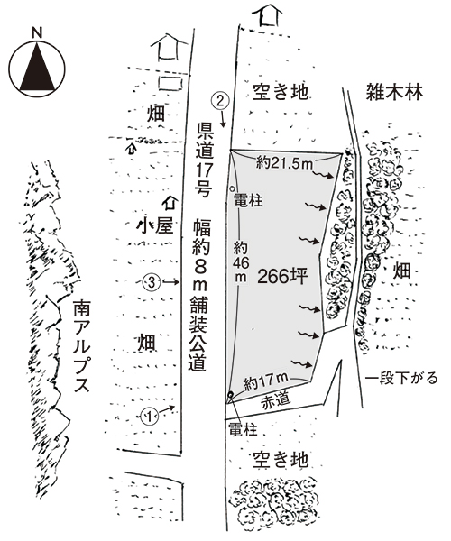 長坂町長坂下条地区。長坂ICから南方向へ標高を下がること車で約7分。幹線道路である県道17号(七里岩ライン)に面した土地で、敷地面積は266坪のゆとりがあるもの。道路と敷地は高低差が無く進入しやすい。周辺はのどかな田園エリア。敷地西側の県道の先には畑が広がり、その先に甲斐駒ヶ岳、鳳凰三山といった南アルプスの山並みがパノラマに広がる。周囲には大きな建物がなく、日当たりも良く、開放的な眺めだ。敷地は概ね平坦な地勢で、東側が傾斜している。公営水道が前面道路の西側、公共下水が前面道路の東側より引込が出来る。幹線道路沿いであることと、眺望の良さからご商売にも向きそうだ。