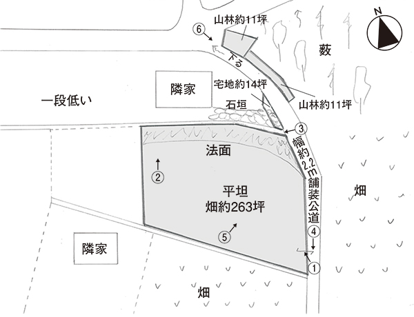 東側が幅約2.2mの舗装公道に接する