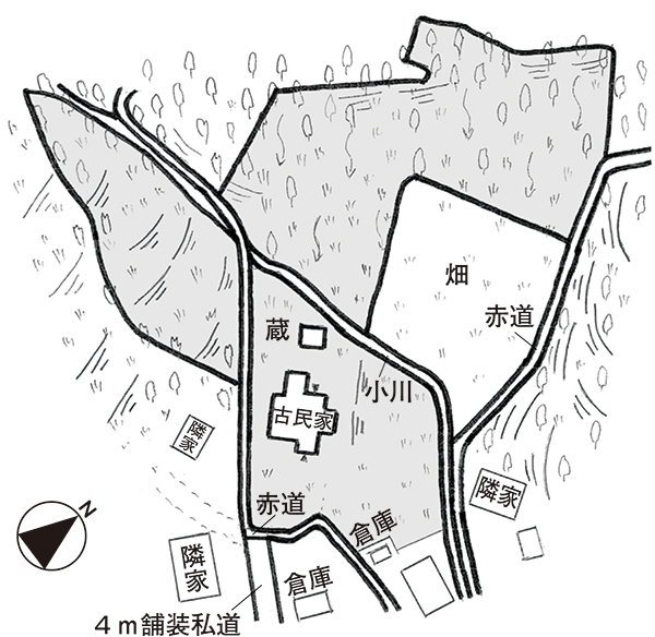 南東側が幅約4mの舗装私道に接する。