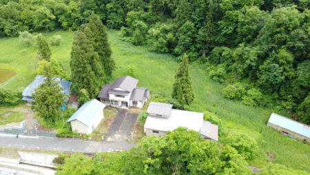 喜多方市山都町は飯豊山の登山口としての宿場町や、ブランドである宮古そばの一大産地として有名で、四季折々の景色が美しい田舎暮らしにはちょうど良いロケーションが広がっている。今回の物件は阿賀川水系の五枚沢川の川沿いにある物件で、絶えず川のせせらぎやウグイスを始めとした鳥の鳴き声が聴こえる落ち着いた環境。物件には築50年の母屋とそれ以前の土蔵や倉庫が多い農家で、葦の草原が広がっている農地はかつてタバコを生産していた過去がある。開拓者精神のある方は一から整地して作物が実る大地を作り上げて頂きたい。母屋は状態的に休憩所や作業所として使うのが望ましいだろう。