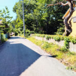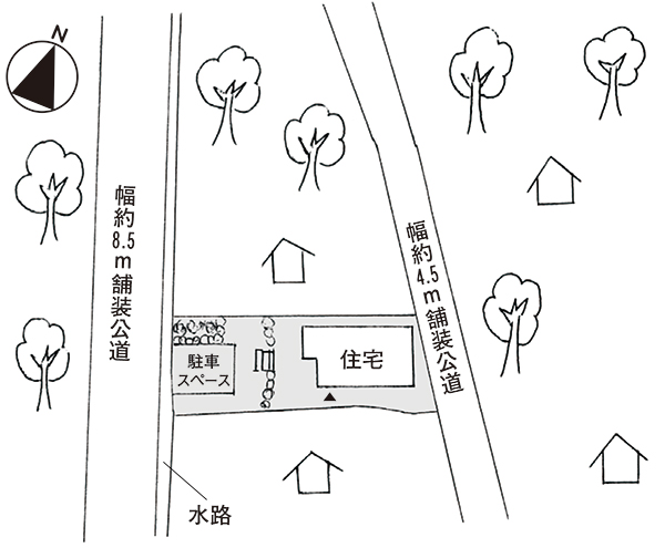西側が幅約8.5m、東側が幅約4.5mの舗装公道に接する。