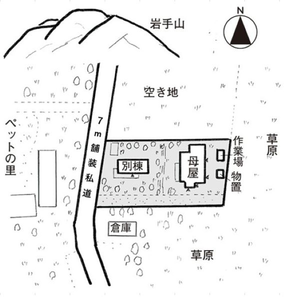 日本百名山・岩手山の南麓に広がる爽やかな高原。物件は、犬や猫の保護施設「ペットの里」の隣に建つ。隣家は北側に50m離れたところに1軒のみ。母屋は西側公道から5mくらい高い地盤に建つため、北に岩手山を仰ぎ見る、東西南北開放的なロケーション。母屋1階は小さな階段を随所に設けた独特な作り。ペアガラス仕様、薪ストーブなどの寒さ対策も。2階は一部屋で北側窓外には岩手山の勇姿。道路側の別棟は1階を車庫にした2DKで普通に暮らせる。東側の作業場には流し台がある。別棟は賃貸にしたり、民泊用途でも良いかもしれない。牧場的な草原が広がる環境はとても希少。盛岡駅までは車で30分と生活も便利だ。