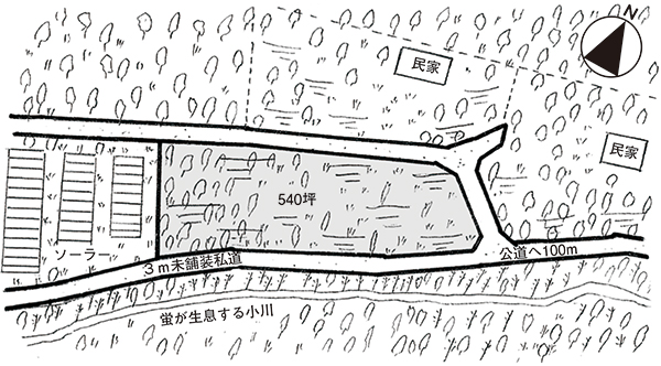ふるさと会員も近隣で田舎暮らしをしている山間。手付かずの森に作られた、区画の大きな分譲地の一つ。公道からは100mくらい入って行く。540坪の土地は南傾斜、東端に位置するため3方向接道。居住者以外はまず入って来ない道路のため、外からの視線は殆ど気にならないだろう。南側の小川では蛍が舞うという素晴しさもある。ナラなどの自然木を活かして、自分らしく隠れ家を作ってみても良い。遊び疲れた身体を癒す芦野温泉へは車で3分。