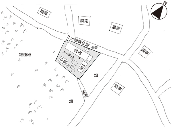 北西側が幅約3.5mの舗装公道に接する