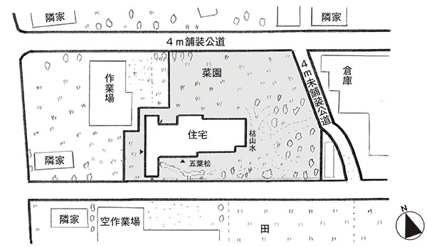 南西側、北東側が幅約4mの舗装公道、南側が幅約4mの未舗装公道に接する。