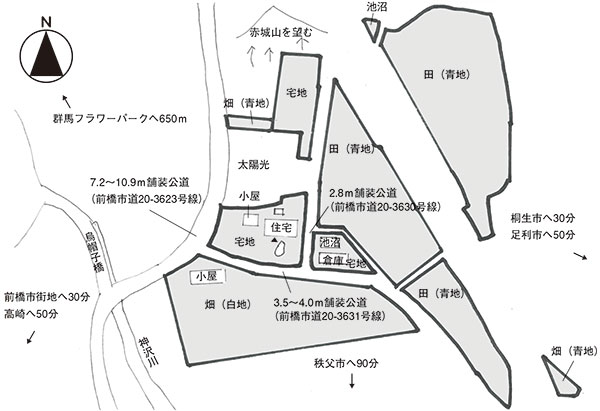 赤城山の南麓に広がる鼻毛石町のユニークな地名の由来は赤城山の噴火で落ちた石に小さな穴があり、草や苔が生えて鼻毛のように見えることから名付けられたといわれる。物件は約385坪の土地に建物が3棟建つ。物件は大きく劣化した場所がなく、すぐにでも住めるため家族で移住するのも良いだろう。畑には約100本の渋柿の木、約2750坪の田んぼでは米作り、大規模な農業にチャレンジしたい方にピッタリの環境だ。三年に一度だが線下保障+電力設備借地料も貰えるので物件に住みながら収益を見込めるのもありがたい。付近には数件の日帰り温泉もあるため毎日湯めぐりをするのも良いだろう
