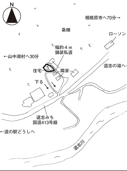 オギノ山中湖店へ約20.9km、ローソンへ約350m、病院へ約2.2km、道の駅どうしへ約2.0km、道志の湯へ約3.5km、役場へ約3.7km