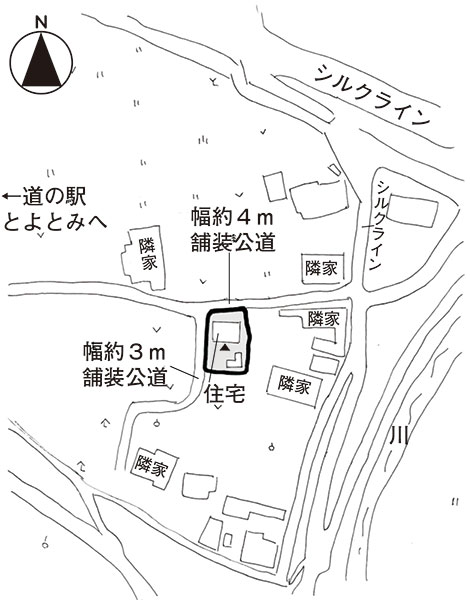 北側が幅約4.6m、西側が3.0mの舗装公道に接する