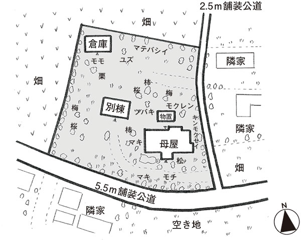南側が幅約5.5m、東側が幅約2.5mの舗装公道に接する。