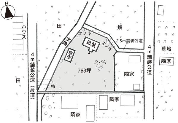 | 接道状況 | 北東側が幅約2.5mの未舗装公道に接する。 |
