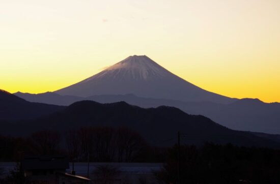 ▲冬の早朝。自宅の近くから見える富士山。(山梨県北杜市)
