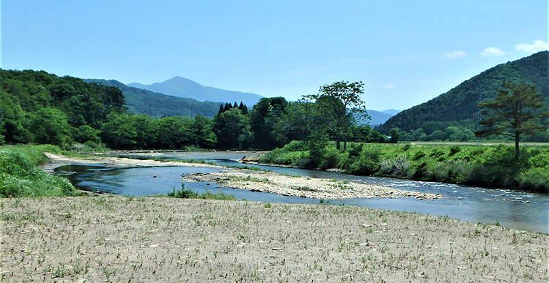 ▲河童伝説のある猿ヶ石川。正面後方は遠野三山のひとつ六角牛山(ろっこうしさん、標高1294m)
